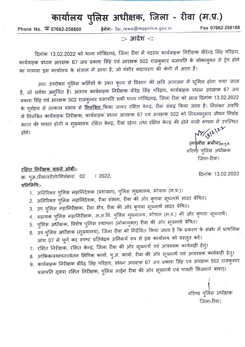 शिकायत के बाद बाद लोकायुक्त एसपी (Rewa Lokayukt SP) ने डीएसपी प्रवीण सिंह परिहार के नेतृत्व में 20 सदस्यीय टीम का गठन करके गोविंदगढ़ थाने में रिश्वत लेते थाना प्रभारी (कार्यवाहक इंस्पेक्टर) वीरेंद्र सिंह परिहार, प्रधान आरक्षक (कार्यवाहक) जय प्रकाश सिंह और आरक्षक राजकुमार प्रजापति को रिश्वत लेते पकड़ा था। रिश्वतखोर पुलिसकर्मियों को करतूत सामने आने के बाद एसपी नवनीत भसीन ने रविवार देस शाम आदेश निकालकर तीनों को निलंबित कर दिया।
