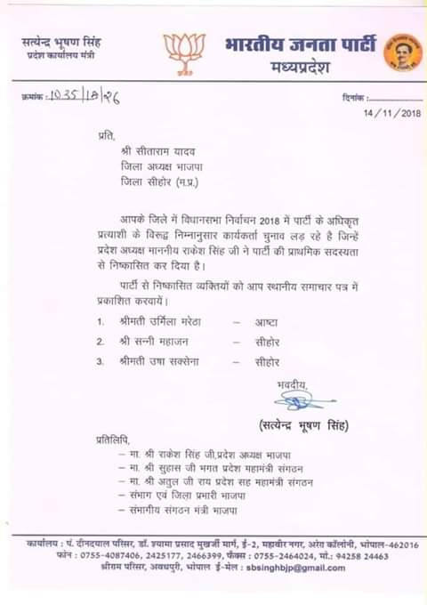 15 महीनों बाद राजनीति ने आचनक करवट बदली और प्रदेश में फिर भाजपा की सरकार का आगाज हुआ| शिवराज सिंह चौहान फिर से मुख्यमंत्री बने| भाजपा की सरकार बनते ही भाजपा से कांग्रेस में गए राजनेताओं का फिर से भाजपा के प्रति प्रेम जाग गया है| जिला पंचायत अध्यक्ष उर्मिला मरेठा फिर से भाजपा के कार्यक्रमो में शामिल होने लगी है|