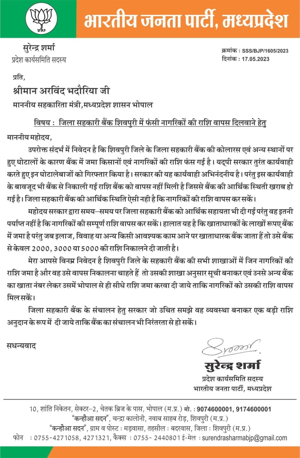 Surendra Sharma wrote a letter to Cooperative Minister : भारतीय जनता पार्टी के प्रदेश कार्यसमिति सदस्य सुरेंद्र शर्मा ने शिवपुरी जिले के सहकारी बैंक की विभिन्न शाखाओं में फंसी नागरिकों की जमापूँजी वापस करवाने के लिए सहकारिता मंत्री को पत्र लिखा है। अरविंद सिंह भदौरिया को लिखे पत्र में उन्होने कहा है कि आम लोग अपने ही पैसों के लिए भटक रहे हैं और बैंक से उन्हें नाममात्र की राशि मिल पा रही है। ऐसे में उनकी परेशानियों का हल करने के लिए जल्द से जल्द कोई निराकरण किया जाए।