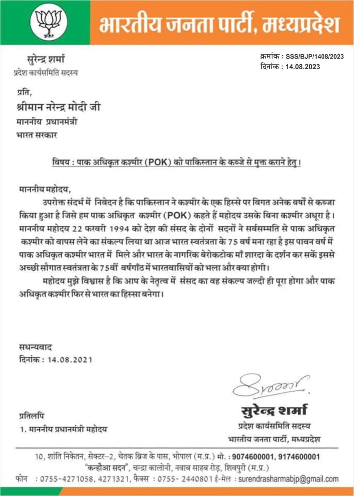 Surendra Sharma wrote a letter to PM Modi : भारतीय जनता पार्टी के प्रदेश कार्यसमिति सदस्य सुरेंद्र शर्मा ने प्रधानमंत्री नरेंद्र मोदी को पत्र लिखा है। इस पत्र में उन्होने पाक अधिकृत कश्मीर (PoK) को पाकिस्तान के कब्जे से मुक्त कराने की मांग करते हुए संसद द्वारा लिये गये संकल्प का स्मरण करवाया है।