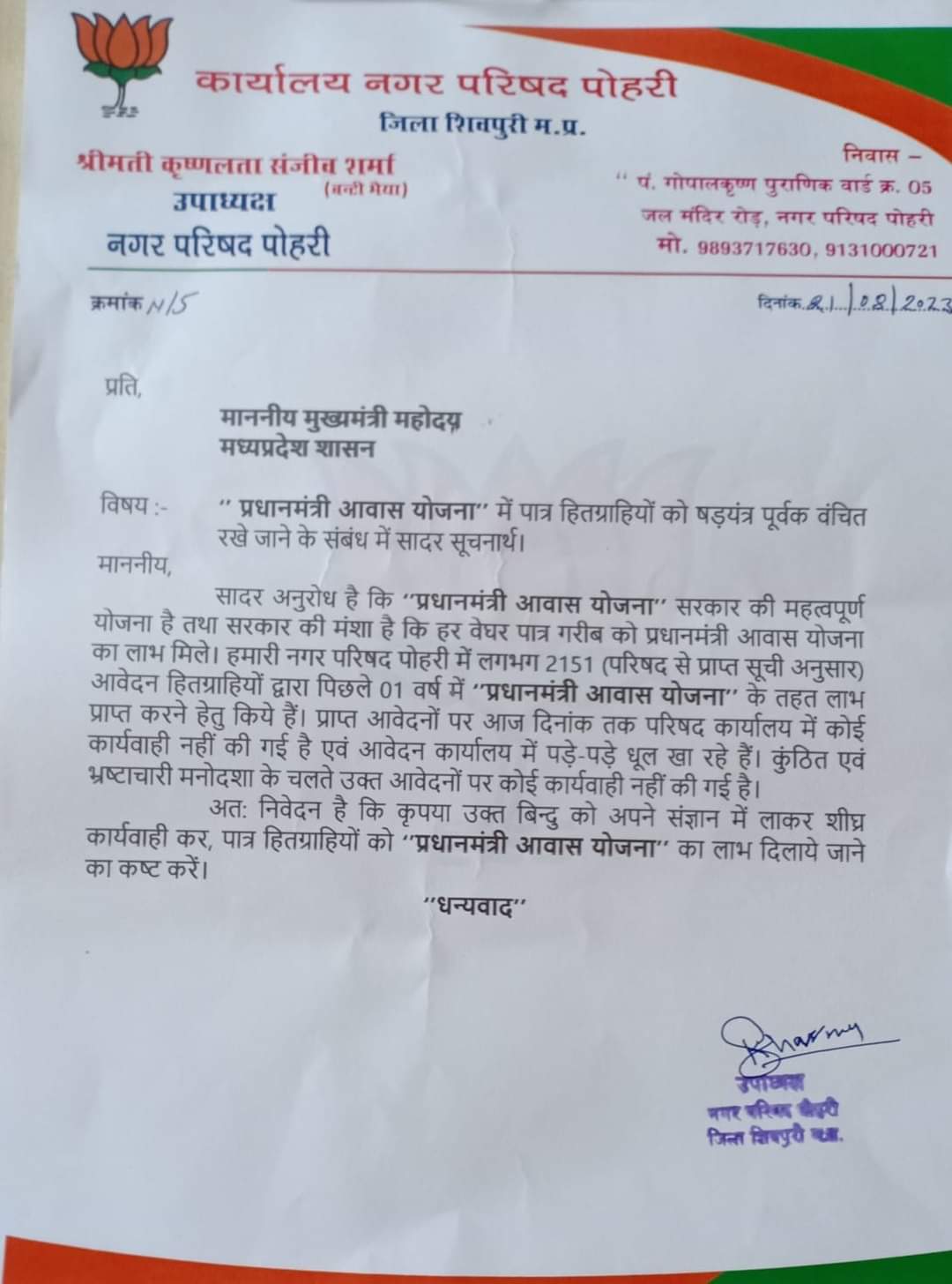 मप्र में भी शिवराज सरकार इस योजना का लाभ गरीबों को दिला रही है, अब तक लाखों पात्र हितग्राही इसका लाभ ले चुके है और कई अभी कतार में हैं लेकिन शिवपुरी जिले की पोहरी नगर परिषद का मामला कुछ अलग है, नगर परिषद् की उपाध्यक्ष और भाजपा नेत्री कृष्णलता संजीव शर्मा ने मुख्यमंत्री शिवराजसिंह चौहान को एक पात्र लिखा है जिसमें परिषद् के अधिकारियों की शिकायत की है।