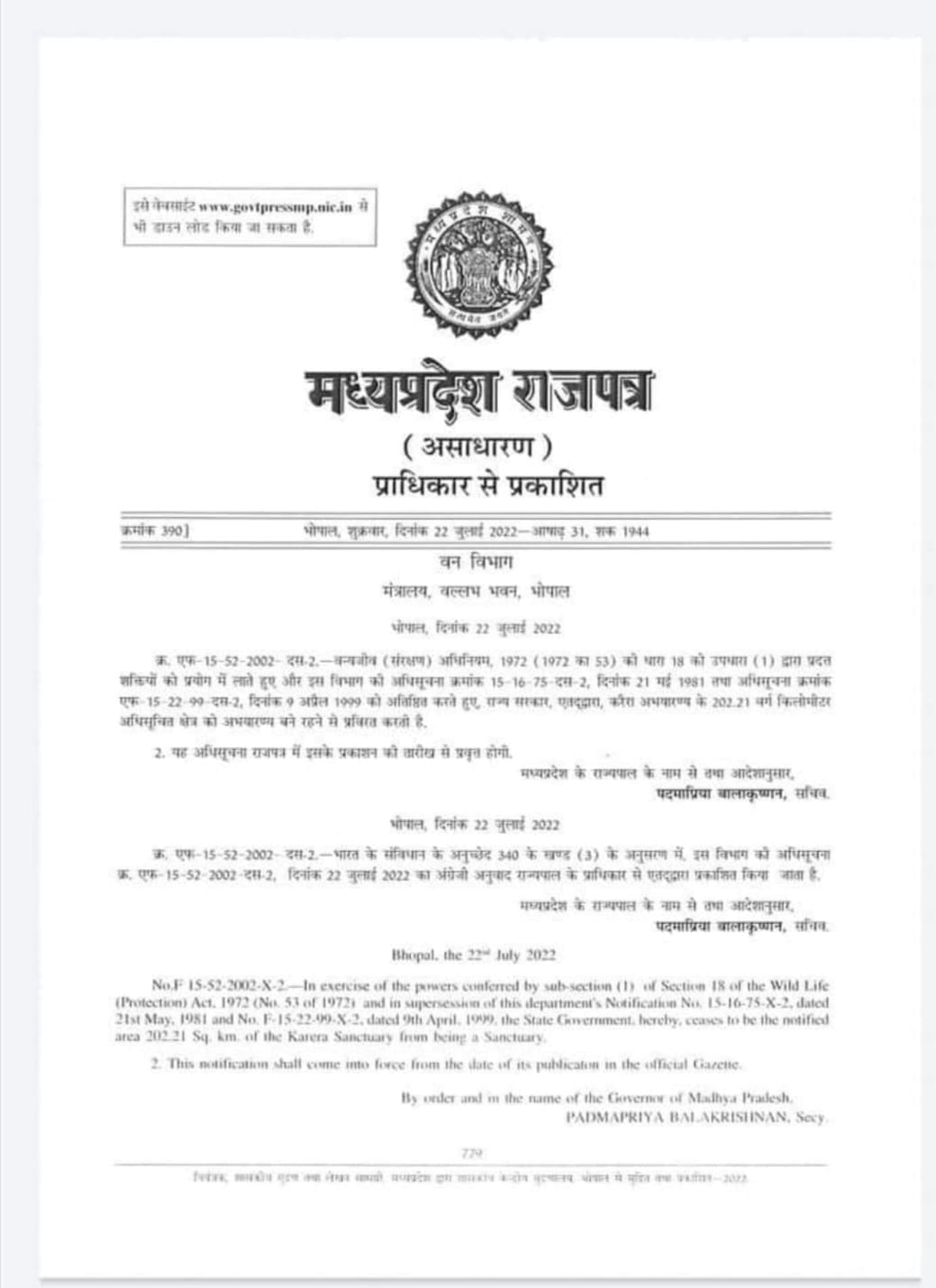 शिवपुरी से करीब 40 किलोमीटर दूर जिले के करैरा क्षेत्र के सोन चिरैया अभ्यारण (Karera Son Chiraiya Sanctuary) के 202.21 वर्ग किलोमीटर क्षेत्र राज्य शासन ने अभ्यारण से मुक्त घोषित कर दिया है। सरकार ने इसका गजट नोटिफिकेशन भी जारी कर दिया है। सरकार के इस फैसले के बाद करैरासोन चिरैया अभ्यारण्य में बसे 32 गांवों के निवासी बहुत खुश हैं।
