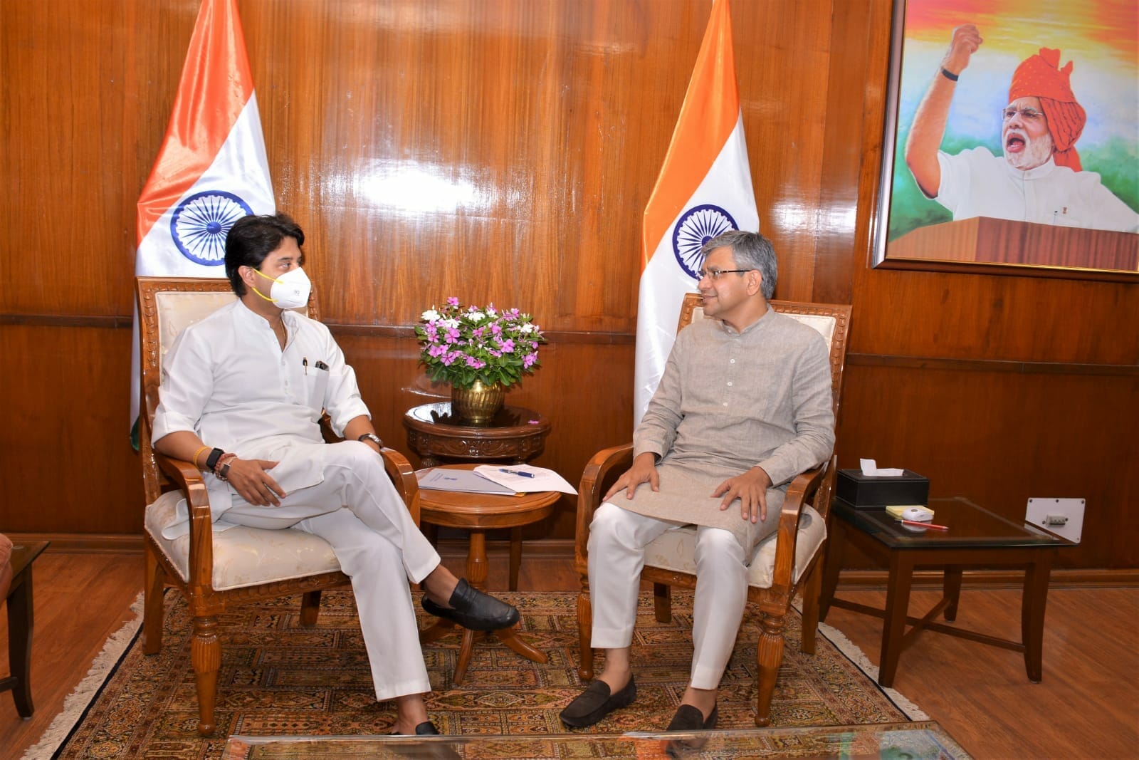 शिवपुरी, मोनू प्रधान। भारत सरकार के नागर विमानन मंत्री ज्योतिरादित्य सिंधिया (Jyotiraditya Scindia) ने गुरूवार को रेलमंत्री अश्वनी वैष्णव (Railway Minister Ashwani Vaishnav) से मुलाकात की। जिसमें ग्वालियर-चंबल अंचल की रेल से संबंधित लंबित विविध मुद्दों पर विस्तृत चर्चा की और उनके त्वरित समाधान का अनुरोध किया। जिसपर रेल मंत्री वैष्णव ने मंत्री सिंधिया को आश्वश्त किया है कि उनके द्वारा रखी गई सभी मांगों का प्राथमिकता से समाधान किया जाएगा। जिसके लिए सिंधिया ने रेल मंत्री का आभार व्यक्त किया।