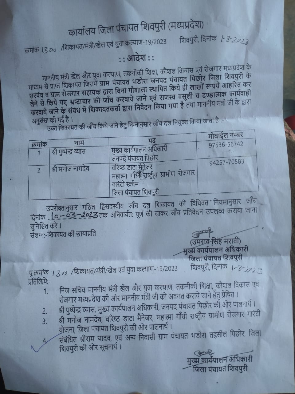 गौरतलब है कि मंत्री यशोधरा राजे सिंधिया द्वारा मामले में इंटरफेयर करने के बाद जिला पंचायत सीईओ ने एक जांच टीम का गठन किया था। जिला पंचायत सीईओ ने जांच टीम में पिछोर के तत्कालीन सीईओ पुष्पेंद्र ब्यास व वरिष्ठ डाटामैनेजर महात्मा गांधी राष्ट्रीय ग्रामीण रोजगार गारंटी स्कीम के मनोज नामदेव को जांच करके 10 मार्च को जांच प्रतिवेदन सौंपने का आदेश दिया था।
