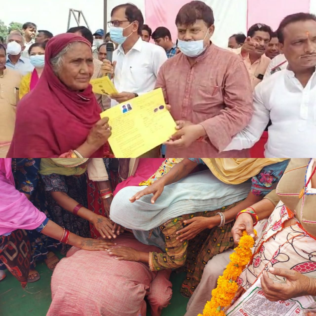 ग्वालियर, अतुल सक्सेना। गरीबों और बेघर लोगों को पट्टा देने का शिवराज सरकार (Shivraj Government) का वादा आज बुधवार को ग्वालियर में पूरा होता दिखाई दिया। जिन 28 लोहा पीटा परिवार (Loha pita Family) को दो साल पहले फुटपाथ से हटाया गया था आज सरकार ने उन्हें बसने के लिए जगह का मालिकाना हक़ दिया। ऊर्जा मंत्री प्रद्युम्न सिंह तोमर (Energy Minister Pradyuman Singh Tomar) ने इन परिवारों को अपने हाथ से पट्टे के प्रमाण पत्र सौंपे। ऊर्जा मंत्री ने जमीन पर बैठकर उनकी समस्याएं सुनी फिर आदत के अनुसार महिलाओं के पैरों में अपना सिर रख दिया। रहने के लिए जमीन मिलने से खुश बुजुर्ग महिलाओं ने जी भर कर मंत्री को आशीर्वाद दिया।