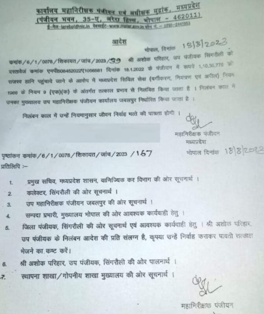 कार्यालय महानिरीक्षक पंजीयन एवं अधीक्षक मुद्रांक भोपाल ने पिछले दिनों एक आदेश जारी कर सिंगरौली में पदस्थ अशोक परिहार को निलंबित कर दिया है, आदेश में कहा गया है कि अशोक परिहार पर शासन को 1 करोड़ 10 लाख 36 हजार 775 रुपये की राजस्व हानि पहुंचाने का आरोप है ।