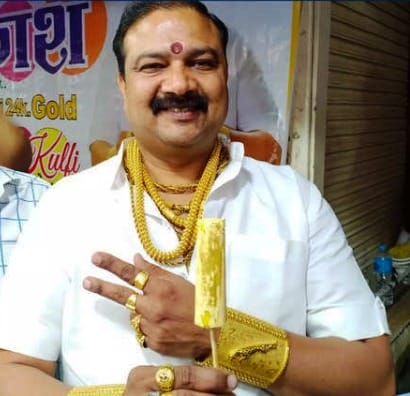 आपको बता दें, सराफा बाजार में कुल्फी फालूदा बेचने वाले गोल्डमैन के नाम से मशहूर बंटी भैया उर्फ बंटी यादव 2 किलो आभूषण पहनकर गोल्ड कुल्फी और फालूदा बैठते हैं। जब उनसे गोल्ड कुल्फी के बारे में बात की गई तो उन्होंने बताया कि मुझे इतना गोल्ड पहनते हुए देखकर हर कोई हैरान रह जाता है।ऐसे में लोग कहते हैं कि गोल्डन वर्क की कुल्फी क्यों नहीं बनाते आप?