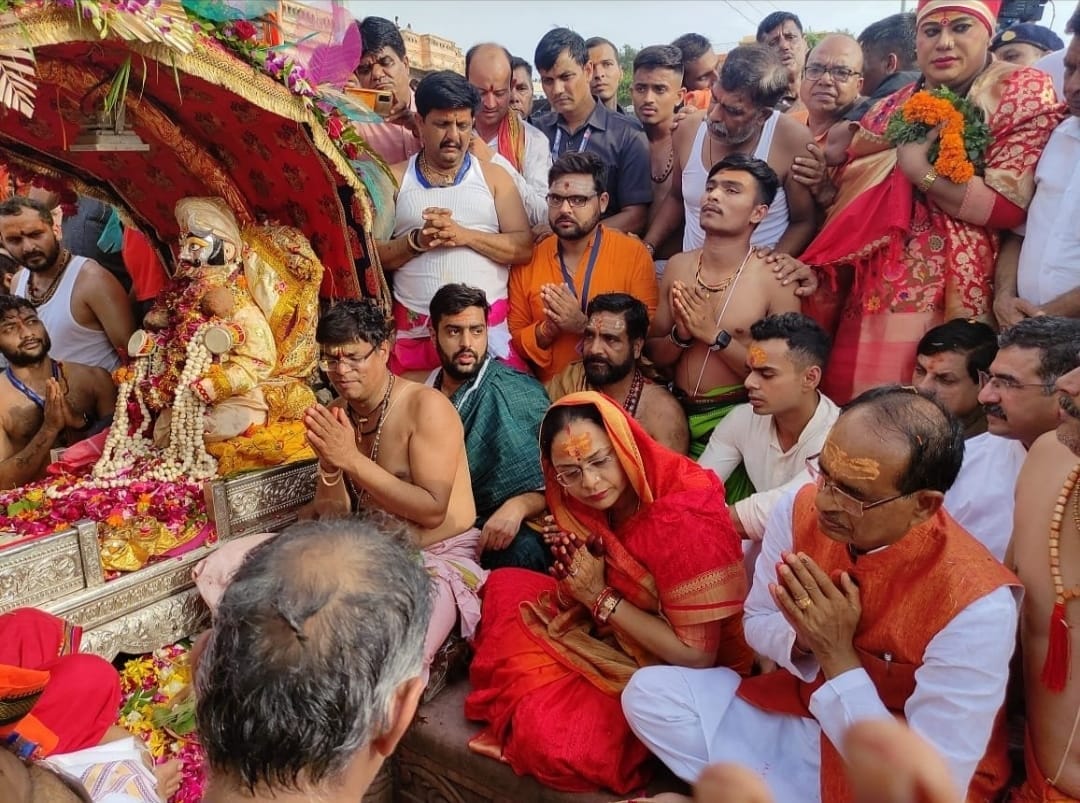 महाकाल महायोगिन महाकाल नमोस्तुते।।#श्रावण_मास के पवित्र तृतीय #सोमवार को भगवान महाकाल की सवारी में सम्मिलित होने और दर्शन व पूजन का सौभाग्य प्राप्त हुआ।हे प्रभु, अपनी करुणा, दया और कृपा की वर्षा सब पर करते रहना, यही प्रार्थना! जय महाकाल! : CM pic.twitter.com/jXRWmIvipX