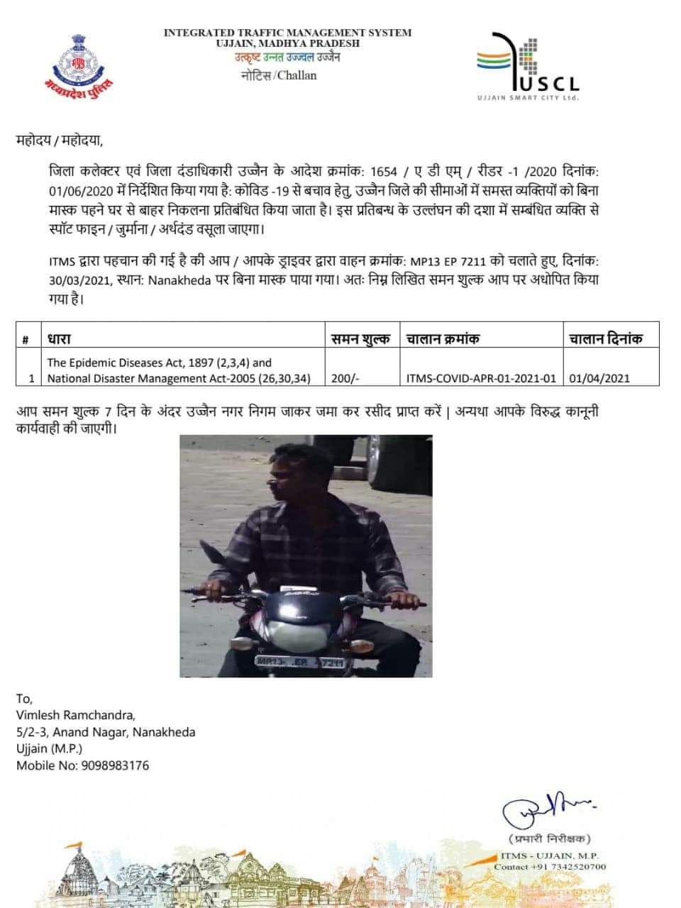 उज्जैन, बाबूलाल सारंग। जिले में लगातार कोरोना संक्रमितों की संख्या में इजाफा हो रहा है। ऐसे में लोगों को प्रशासन की तरफ से मास्क लगाने की हिदायत दी जा रही है। लेकिन लोग कोरोना को लेकर लापरवाही बरत रहे हैं। जहां मास्क नहीं पहनने वालों के खिलाफ कार्रवाई करने के लिए अब टेक्नोलॉजी की मदद ली जा रही है। इंटीग्रेटेड ट्रैफिक मैनेजमेंट सिस्टम (Integrated Traffic Management System) के कमांड एंड कंट्रोल से शनिवार को उज्जैन शहर में 64 बाइक सवारों के चालान काटे गए। यह जानकारी स्मार्ट सिटी के सीईओ जितेंद्र सिंह चौहान द्वारा दी गई।