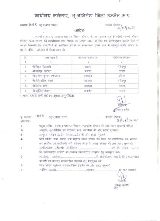 उज्जैन, डेस्क रिपोर्ट। मध्यप्रदेश में तबादले (MP transfer) पर दोबारा बैन (ban) लगने के बाद भी पुरानी तारीखों में आदेश जारी होने का सिलसिला जारी है। दरअसल मध्य प्रदेश के उज्जैन (ujjain) जिले में 51 पटवारियों (patwaris) के तबादले किए गए हैं।
