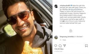इतना ही नही विक्की कौशल ने इंस्टाग्राम अकाउंट पर अपनी एक फोटो शेयर की है जिसमें वह हाथ में समोसा पकड़े नजर आ रहे हैं। उन्होंने कैप्शन में लिखा, ”कहा था नहीं खा पाऊंगा पर रहा नहीं गया। ऐसे फैन के होने से बहुत खुशी हुई जो जानती है कि मुझे बहुत भूख लगी है। मम्मी पापा को बिना बताए एयरपोर्ट मिलने आ गई, साथ में समोसे-जलेबी लेकर। आंटी-अंकल गुस्सा मत कर ना अगर पढ़ ले तो। तुम्हें ढेर सारा प्यार। इंदौर के समोसे वैसे कमाल के हैं यार।”