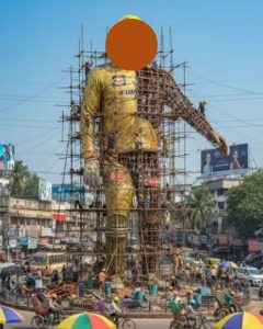 ”A giant hyper-realistic statue of a young man wearing a cap, sunglasses, light-colored casual t-shirt, and dark jeans under construction in the middle of a busy city roundabout. The statue is surrounded by scaffolding with construction workers in yellow helmets and orange vests climbing, welding, and working on different sections. The background features a historic red-brick building with domes and arched windows, while bustling street life continues below with pedestrians, rickshaws, and vehicles. Cinematic lighting, 8K ultra-detailed realism, dramatic urban atmosphere.”