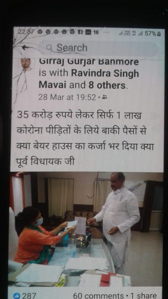 पूर्व विधायक रघुराज कंषाना जो कांग्रेस छोड़कर अभी हाल ही में बीजेपी में शामिल हुए थे। उन्होंने सिटी कोतवाली में रिपोर्ट दर्ज कराई है कि मेरे द्वारा कोरोना वायरस संक्रमण रोक के चलते 28 मार्च को मुख्यमंत्री राहत कोष में एक लाख रुपए सहायतार्थ दिए गए थे जिसके उपरांत इसी दिन शाम सात बजे आरोपी गौरव जैन व यादवेन्द्र सिंह गुुर्जर के द्वारा फेसबुक पर मेरे खिलाफ एक पोस्ट डाली जिसमें लिखा था 35 करोड़ रुपए लेकर सिर्फ एक लाख रुपए कोरोना पीडि़तों के लिए बाकी पैसों से क्या बेयर हाउस का कर्जा भर दिया क्या पूर्व विधायक। साथ में मेरी फोटो भी लगाई है।