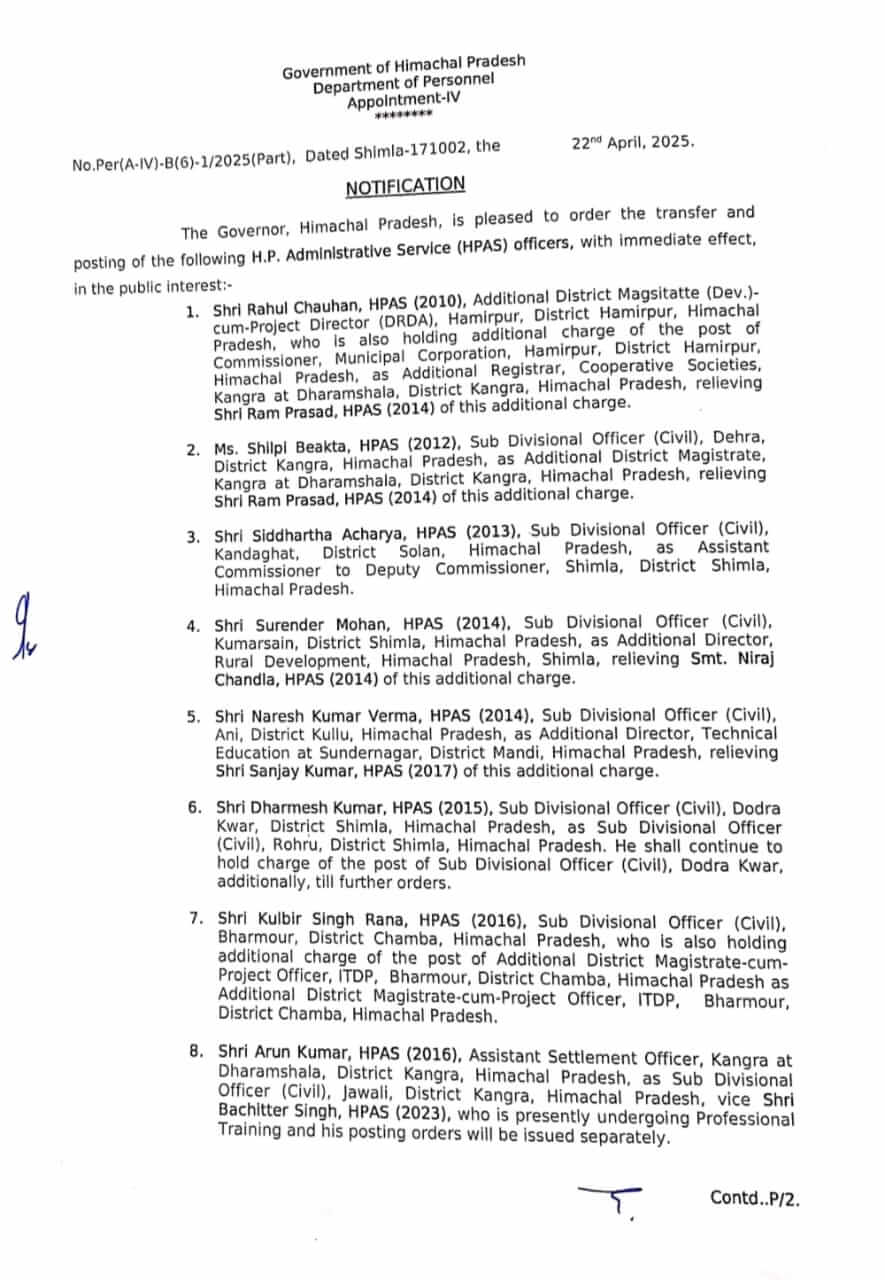 - सहायक सचिव राजस्व मोहित रतन को एसडीएम धर्मशाला।