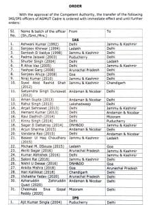 केन्द्र सरकार ने एजीएमयूटी (AGMUT) कैडर में बड़ा प्रशासनिक फेरबदल करते हुए 49 अधिकारियों के तबादले किए हैं। इनमें 31 आईएएस (भारतीय प्रशासनिक सेवा) और 18 आईपीएस (भारतीय पुलिस सेवा) अधिकारी शामिल हैं। गृह मंत्रालय (Home Ministry) के 4 जनवरी 2026 (रविवार) को जारी आदेश के अनुसार, दिल्ली के साथ पुडुचेरी, अंडमान एवं निकोबार, लद्दाख, गोवा, अरुणाचल प्रदेश, जम्मू एवं कश्मीर, मिजोरम, चंडीगढ़, लक्षद्वीप, दादर एवं नगर हवेली तथा दमन एवं दीव के अधिकारियों के पदस्थापना/ट्रांसफर किए है।