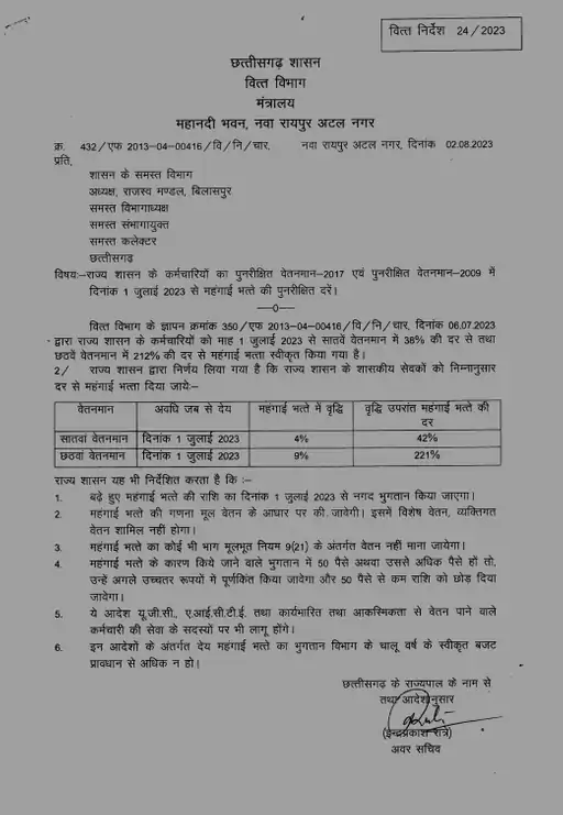 हालांकि जुलाई महीने में इसके लिए आदेश जारी नहीं किए गए थे। जिसके कारण कर्मचारियों को 38 फीसद की दर से ही महंगाई भत्ते का लाभ देते हुए सैलरी का भुगतान किया गया था। वहीं राज्य शासन द्वारा आदेश जारी किया गया है। जिसके तहत महंगाई भत्ते को चार फीसद की दर से बढ़ा दिया गया है। इसके साथ ही महंगाई भत्ते की दर बढ़कर 42% हो गई है यानी छत्तीसगढ़ के कर्मचारियों को भी अब केंद्र सरकार के कर्मचारियों के समान 42 फीसद महंगाई भत्ते का लाभ उपलब्ध कराया जाएगा। महंगाई भत्ते में वृद्धि जुलाई महीने से लागू की गई है।