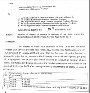 राज्य की जयराम ठाकुर सरकार ने संशोधित वेतनमान के एरियर के संबंध में आदेश जारी कर दिया है।शनिवार को अतिरिक्त मुख्य सचिव वित्त प्रबोध सक्सेना के जारी आदेशानुसार इसी महीने में लाखों कर्मचारियों को संशोधित वेतनमान के एरियर का भुगतान नकद किया जाएगा।गुप्र ए, बी, सी के कर्मियों को 50,000 और डी श्रेणी के कर्मियों को 60,000 रुपये तक का एरियर नकद मिलेगा।