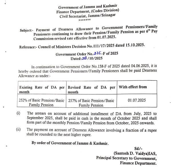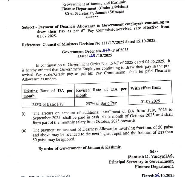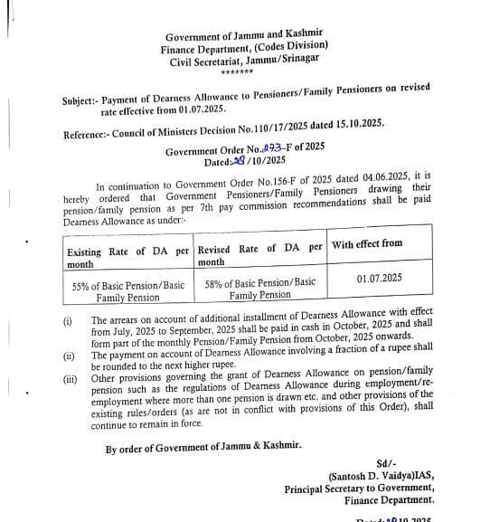 JK Employees Pensioners DA Hike : जम्मू कश्मीर के सरकारी कर्मचारियों , पेंशनरों और फैमिली पेंशन धारकों के लिए खुशखबरी है।राज्य की उमर अब्दुल्ला सरकार ने 7वें और छठे वेतनमान के तहत काम करने वाले कर्मचारियों और पेंशनरों को बड़ा तोहफा दिया है। राज्य सरकार ने 7वें वेतनमान वालों के डीए में 3 फीसदी की वृद्धि की है जिसके बाद डीए की दर 55 फीसदी से बढ़कर 58 फीसदी पहुंच गई है।वही छठे वेतनमान वालों के डीए में 5 फीसदी बढ़ोत्तरी की गई है, जिसके बाद डीए की दर 252 फीसदी से बढ़कर 257 फीसदी पहुंच गई है। नई दरें जुलाई 2025 से लागू होंगी। इससे प्रदेश के 5.10 लाख कर्मचारियों और 2.40 लाख पेंशनधारकों को लाभ मिलेगा।इस संबंध में वित्त विभाग ने चार अलग अलग आदेश भी जारी कर दिए है।