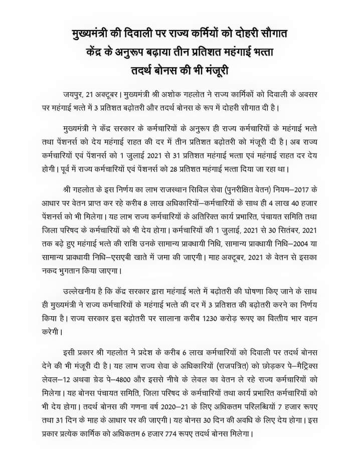दरअसल, हाल ही में राजस्थान के मुख्यमंत्री अशोक गहलोत (Rajasthan Chief Minister Ashok Gehlot) ने ट्वीट कर बताया था कि राज्य कार्मिकों को दिवाली के अवसर पर महंगाई भत्ते में 3 प्रतिशत बढ़ोतरी और तदर्थ बोनस के रूप में दोहरी सौगात दी है।केंद्र सरकार के कर्मचारियों के अनुरूप ही राज्य कर्मचारियों के डीए तथा पेंशनर्स (Pensionors) को देय महंगाई राहत (DA/DR Hike) की दर में 3 प्रतिशत बढ़ोतरी को मंजूरी दी है।अब राज्य कर्मचारियों एवं पेंशनर्स को 1 जुलाई 2021 से 31 प्रतिशत महंगाई भत्ता एवं महंगाई राहत दर देय होगी।