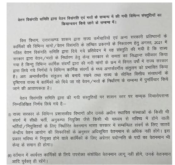 आदेश के मुताबिक, वित्त विभाग, उत्तराखण्ड शासन द्वारा राज्य कर्मचारियों एवं अन्य सरकारी प्रतिष्ठानों के कार्मिकों की विभिन्न मांगों / वेतन विसंगति के लम्बित प्रकरणों के निस्तारण के लिए अगस्त, 2021 में गठित वेतन विसंगति समिति द्वारा दिये गये प्रतिवेदन में यह संस्तुति की गयी है कि राज्य सरकार द्वारा वेतन/भत्तों के निर्धारण हेतु केन्द्र सरकार से समता का सिद्धान्त स्वीकार किया गया है किन्तु विभिन्न कार्मिक संवर्गों द्वारा की गयी मांगों के क्रम में विगत वर्षों में राज्य सरकार द्वारा लिये गये निर्णयों ने विभिन्न कार्मिक संवर्गों के मध्य अन्तर्सवर्गीय संतुलन को प्रभावित किया है। अतः अन्तर्सवर्गीय संतुलन को बनाये रखने तथा राज्य के सीमित वित्तीय संसाधनों के दृष्टिगत राज्य में कार्मिकों को दिये जा रहे वेतन / भत्तों के निर्धारण के सम्बन्ध में पुनर्विचार किये जाने की आवश्यकता है।