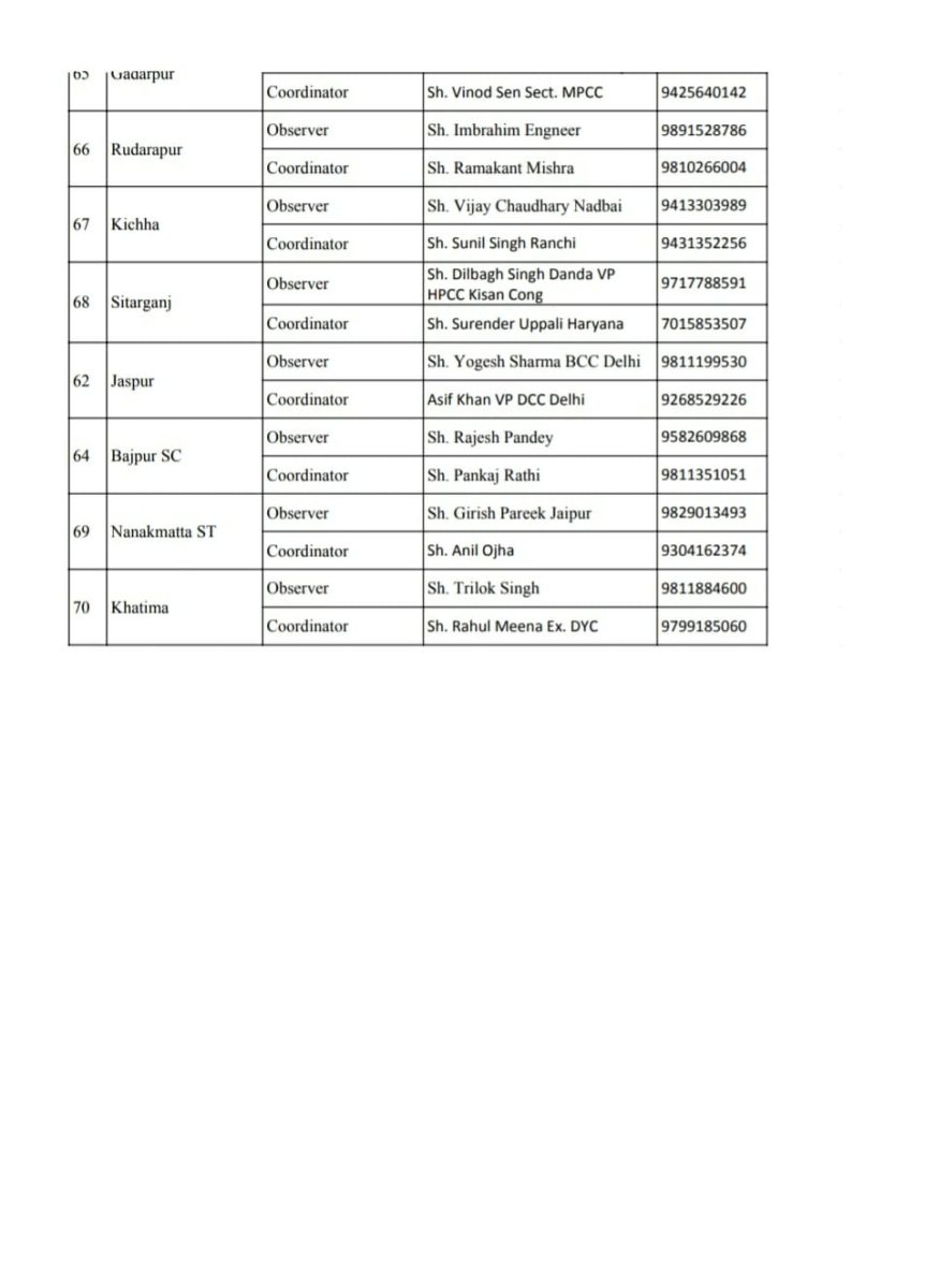 नई दिल्ली, डेस्क रिपोर्ट। उत्तराखंड में होने वाले विधानसभा सीटों और एक लोकसभा सीट के चुनाव के लिए AICC ने तैयारी तेज कर दी है। पार्टी ने आज गुरुवार को ऑब्जर्वर और कोर्डिनेटर (Observer, Coordinator) की सूची जारी कर दी। इसमें अलग अलग राज्यों के 100 से अधिक नेताओं को जिम्मेदारी दी गई है।