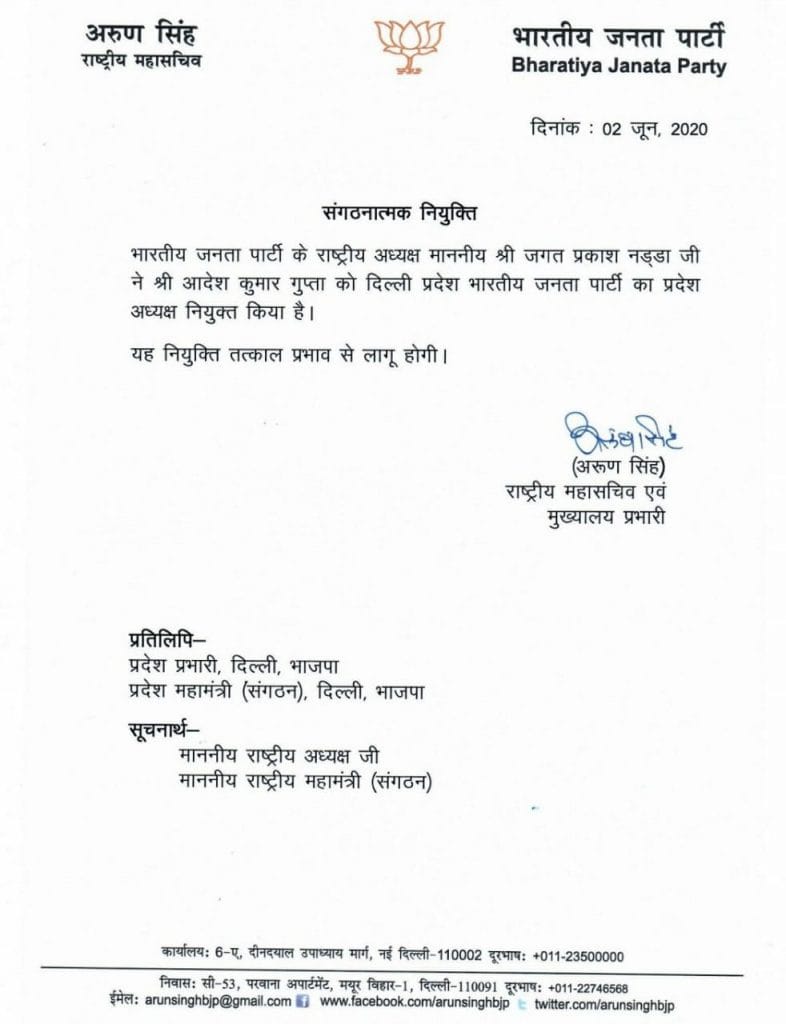 कोरोना संकट में लॉकडाउन 5.0 के लगते ही भाजपा ने बड़ा बदलाव किया है।बीजेपी ने तीन राज्यों के प्रदेश अध्यक्षों को हटा दिया है। दिल्ली बीजेपी अध्यक्ष पद से मनोज तिवारी की छुट्टी हो गई है है, उनकी जगह अब आदेश कुमार गुप्ता को दिल्ली बीजेपी की कमान सौंपी गई है।आदेश गुप्ता उत्तरी दिल्ली नगर निगम के पूर्व महापौर हैं। बता दें कि मनोज तिवारी को 2016 में दिल्ली भाजपा अध्यक्ष नियुक्त किया गया था। सूत्रों का कहना है कि उन्होंने दिल्ली की हार के तुरंत बाद इस्तीफा देने की पेशकश की थी, लेकिन विकल्प नहीं मिलने तक इसे जारी रखने के लिए कहा गया था।