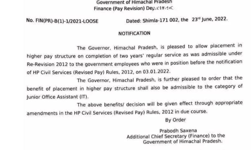 वही पूर्व कांग्रेस सरकार की ओर से वर्ष 2012 में लगाए दो साल के राइडर (प्रोबेशन पीरियड) को हटा दिया गया है। इस संबंध में अतिरिक्त मुख्य सचिव प्रबोध सक्सेना ने अधिसूचना जारी की है।वर्ष 2017 के बाद नियुक्त कर्मचारियों को दो साल के राइडर के फेर से बाहर आने के बाद सबके वेतन में हजारों रुपये प्रतिमाह का लाभ होगा। इसके तहत जूनियर आफिस असिस्टेंट (JOA) को भी उच्च वेतनमान (Higher Pay Scale) का लाभ मिलेगा। मुख्यमंत्री जयराम ठाकुन ने कर्मचारी महासंघ के सम्मेलन में यह घोषणा की थी।