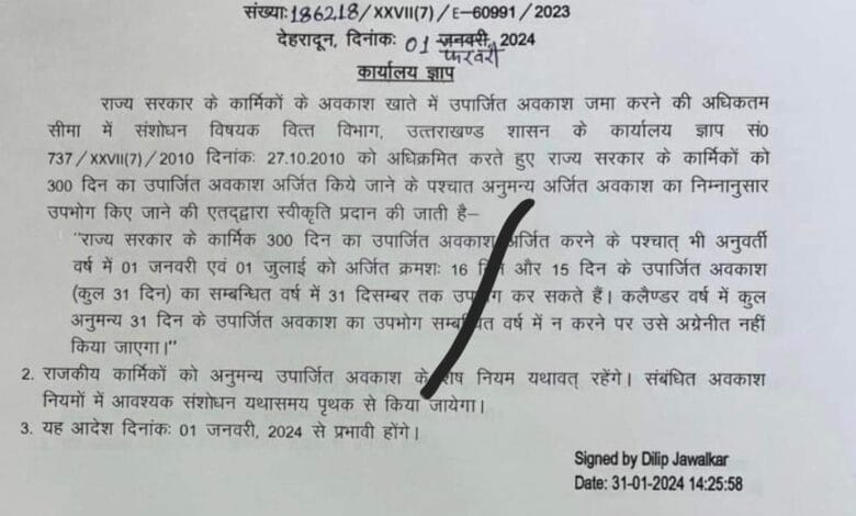 - वित्त विभाग के आदेश के अनुसार, राज्य के सरकारी कर्मचारियों को 300 उपार्जित अवकाश के अलावा अब सालभर के 31 उपार्जित अवकाश एक साथ मिल सकेंगे। सचिवालय संघ ने इस आदेश पर मुख्यमंत्री पुष्कर सिंह धामी, शासन के अफसरों का आभार जताया। इस आदेश का लाभ प्रदेशभर के सरकारी कर्मचारियों को मिलेगा।