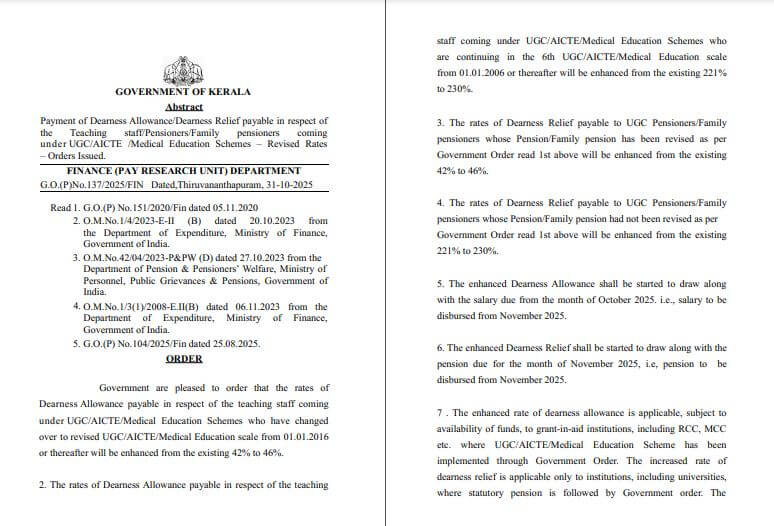 Kerala Employees DA Hike 2025: केरल के सरकारी कर्मचारियों के लिए खुशखबरी है। होली से पहले राज्य की पिनराई विजयन सरकार ने सरकारी कर्मचारियों व पेंशन धारकों के बाद शिक्षकों को बड़ा तोहफा दिया है। राज्य सरकार ने इनका महंगाई भत्ता बढ़ा दिया है।ये आदेश यूजीसी, एआईसीटीई और चिकित्सा शिक्षा योजनाओं के तहत शिक्षण कर्मचारियों और पेंशनभोगियों पर लागू होगा। लेकिन राज्य विद्युत बोर्ड लिमिटेड और राज्य सड़क परिवहन निगम जैसे संगठनों पर लागू नहीं होगा, इनके लिए अलग से आदेश जारी किए जाएंगे।