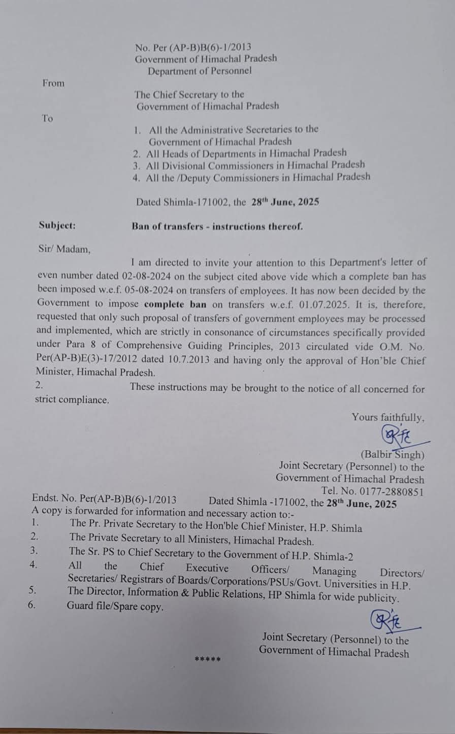 दरअसल, हाल ही शिमला में मुख्यमंत्री सुखविंदर सिंह सुक्खू की अध्यक्षता में हुई कैबिनेट बैठक में तबादलों पर बैन लगाने का फैसला लिया गया था, जिसके बाद अब कार्मिक विभाग ने इस संबंध में सभी प्रशासनिक सचिवों, विभागों के अध्यक्षों, मंडलायुक्त और सभी जिलों के उपायुक्तों को आदेश जारी कर दिए हैं, जिसमें कहा गया है कि हिमाचल में अब 1 जुलाई 2025 से कर्मचारियों के तबादलों पर पूर्णत: प्रतिबंध लग जाएगा।