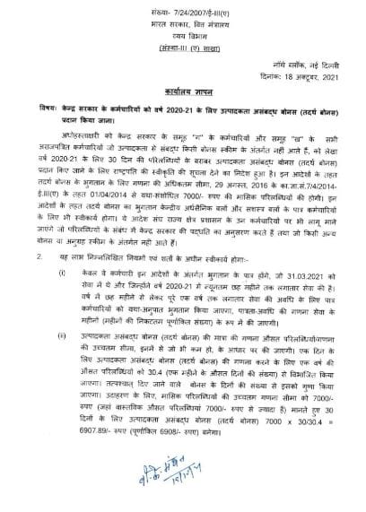 वित्त मंत्रालय के मुताबिक तदर्थ बोनस (Ad-hoc Bonus) के भुगतान की गणना की सीमा 1 अप्रैल 2014 से संशोधित रूप में 7000 रुपये की मासिक परिलब्धियां होगी।इसके तहत उत्पादकता लिंक्ड बोनस योजना के अंतर्गत ना आने वाले ग्रुप ‘C’ और ‘B’ के सभी अराजपत्रित कर्मचारी शामिल होंगे। इसके अलावा केंद्रीय अर्धसैनिक बलों और सशस्त्र बलों के पात्र कर्मचारियों को भी लाभ होगा।व्यय विभाग (DOE), वित्त मंत्रालय के आदेशानुसार, जो कर्मचारी 31 मार्च 2021 की सेवा में थे और वर्ष 2020-21 के दौरान कम से कम 6 महीने की सेवाओं में रहे उन्हें तदर्थ बोनस के भुगतान किया जाएगा।
