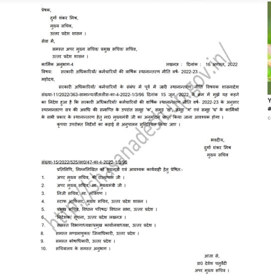 इस शासनादेश में कहा गया है कि सरकारी अधिकारियोंऔर कर्मचारियों की वार्षिक स्थानांतरण नीति वर्ष 2022-23 के अनुसार स्थानांतरण सत्र की अवधि की समाप्ति के उपरांत समूह ‘क’, समूह ‘ख’, समूह ‘ग’ एवं समूह ‘घ’ के कार्मिकों के सभी प्रकार के स्थानांतरण के लिए मुख्यमंत्री योगी आदित्यनाथ का अनुमोदन लेना आवश्यक कर दिया गया है।इतना ही नहीं उन्होंने सभी विभागों के अपर मुख्य सचिव, प्रमुख सचिव और सचिवों को इसका सख्ती से पालन कराने के निर्देश दिए है।