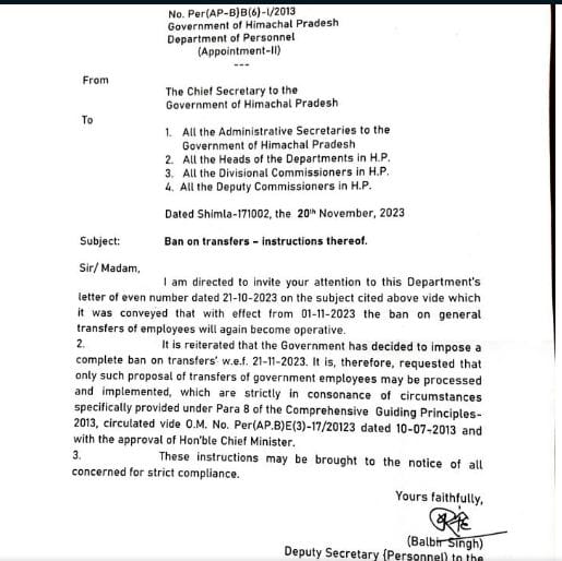Himachal Pradesh Employees news : हिमाचल प्रदेश के सरकारी कर्मचारियों के लिए महत्वपूर्ण खबर है। राज्य की सुखविंदर सिंह सुख्खू सरकार ने आज 21 नवंबर से सरकारी कर्मचारियों के तबादलों पर पूर्ण प्रतिबंध लगा दिया है।इस संबंध में कार्मिक विभाग के मुख्य सचिव प्रबोध सक्सेना ने आदेश भी जारी कर दिया है।इसके तहत अब मंगलवार से अति आवश्यक और प्रशासनिक जरूरत होने पर सिर्फ मुख्यमंत्री की मंजूरी से ही तबादले हो सकेंगे।