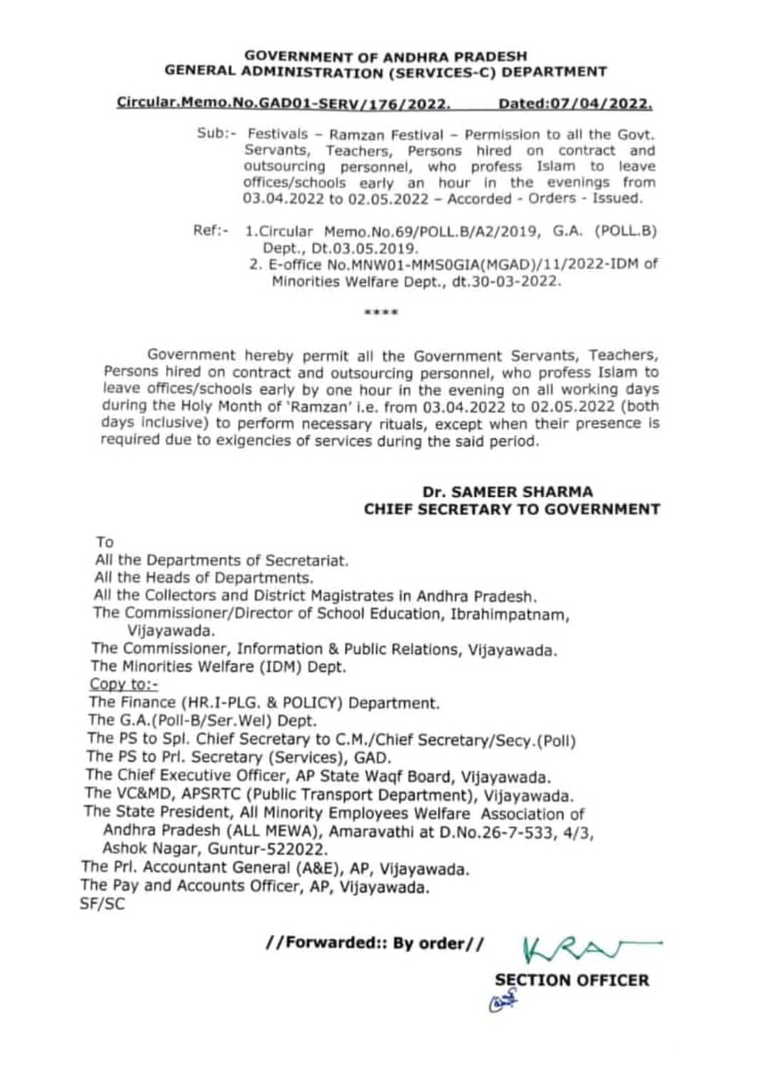 अमरावती, डेस्क रिपोर्ट। आंध्र प्रदेश के सरकारी कर्मचारियों (Andhra Pradesh government employees) के लिए अच्छी खबर है।रमजान में आंध्र प्रदेश सरकार ने मुस्लिम कर्मचारियों को लेकर बड़ा फैसला किया है, इसके तहत कर्मचारी अब रमजान के दौरान जल्दी छुट्टी लेकर घर जा सकते है,इस संबंध में सामान्य प्रशासन विभाग ने आदेश जारी कर दिया है।