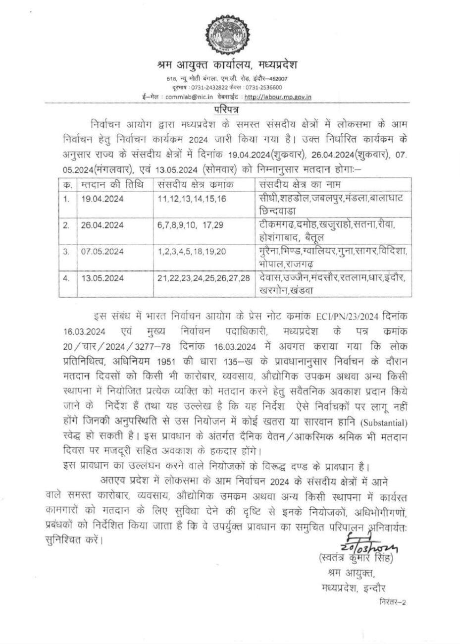 लोकसभा निर्वाचन-2024 के लिए निजी या सार्वजनिक प्रतिष्ठानों, दुकानों औद्योगिक उपक्रम या कारोबार, व्यवसाय में कार्यरत प्रत्येक कामगार को मतदान दिवस के दिन मताधिकार का उपयोग करने के लिए लोक प्रतिनिधित्व 1951 की धारा 135 ख के प्रावधानुसार संबंधितों को सवैतनिक अवकाश प्रदाय किया जाएगा। भारत निर्वाचन आयोग द्वारा छत्तीत्तगढ़ राज्य में मतदान 3 चरणों में सम्पन्न कराया जाएगा, प्रथम चरण में 19 अप्रैल (शुक्रवार) द्वितीय चरण में 28 अप्रैल 2024 (शुक्रवार) एवं तृतीय चरण में 7 मई (मंगलवार) नियत की गई है।