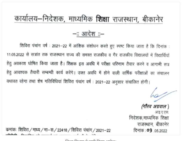 दरअसल,राजस्थान में 17 मई से गर्मियों की छुट्टियां पड़ने वाली थी, लेकिन भीषण गर्मी और हीट वेव के रिकार्ड को देखते हुए शिक्षा विभाग ने एक हफ्ते पहले ही 11 मई से छुट्टियों का ऐलान कर दिया है।इस संबंध में सोमवार देर रात माध्यमिक शिक्षा बोर्ड के निदेशक गौरव अग्रवाल ने आदेश जारी किया है।