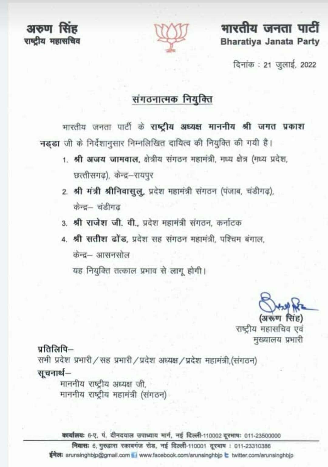 भाजपा ने मध्य क्षेत्र ( मध्य प्रदेश – छत्तीसगढ़) के लिए अजय जामवाल को क्षेत्रीय संगठन महामंत्री, पंजाब और हरियाणा के लिए मंत्री श्रीनिवासुलु को प्रदेश महामंत्री संगठन, कर्नाटक के लिए राजेश जीवी को प्रदेश महामंत्री संगठन और पश्चिम बंगाल के लिए सतीश ढोंड को प्रदेश सह संगठन महामंत्री नियुक्त किया है।