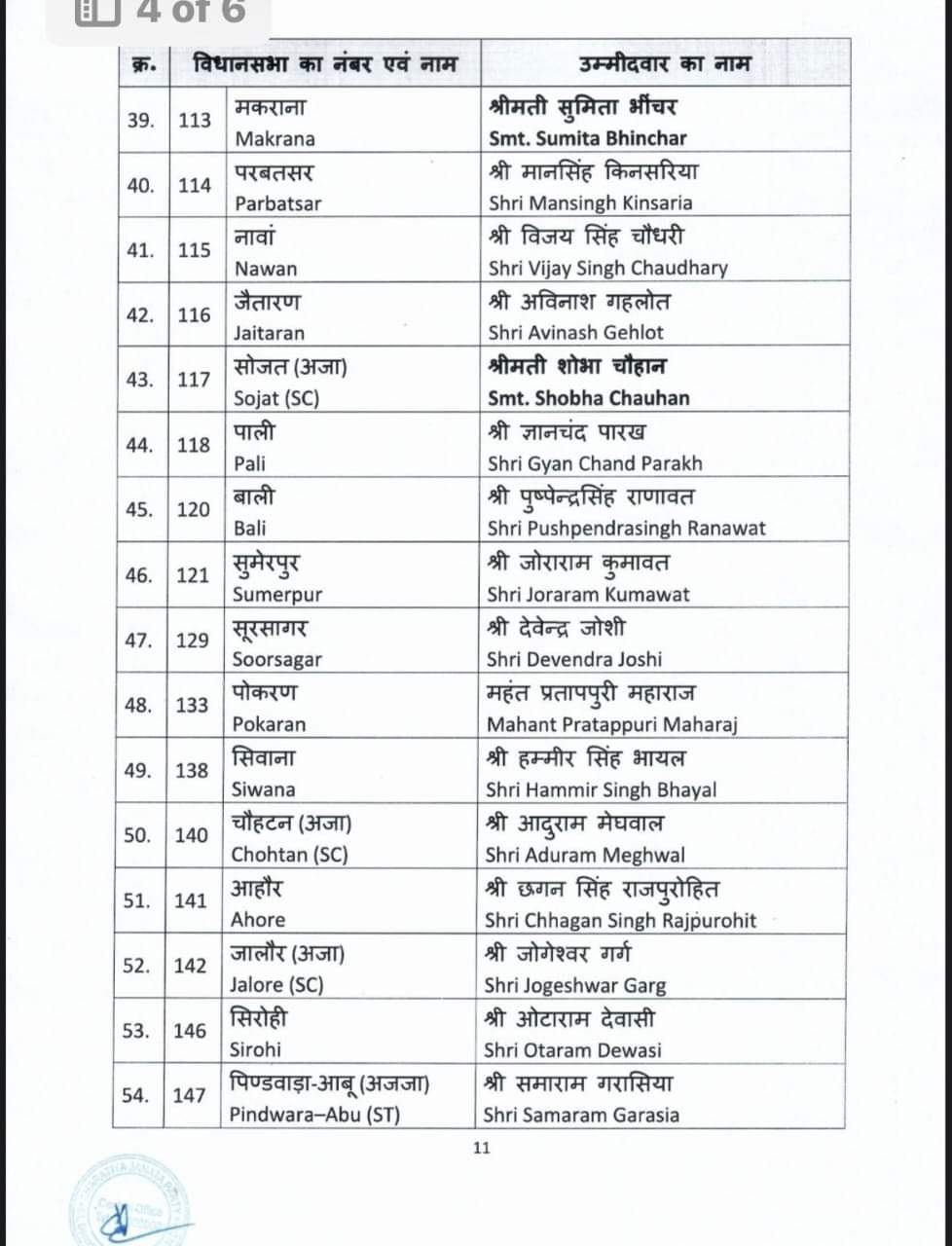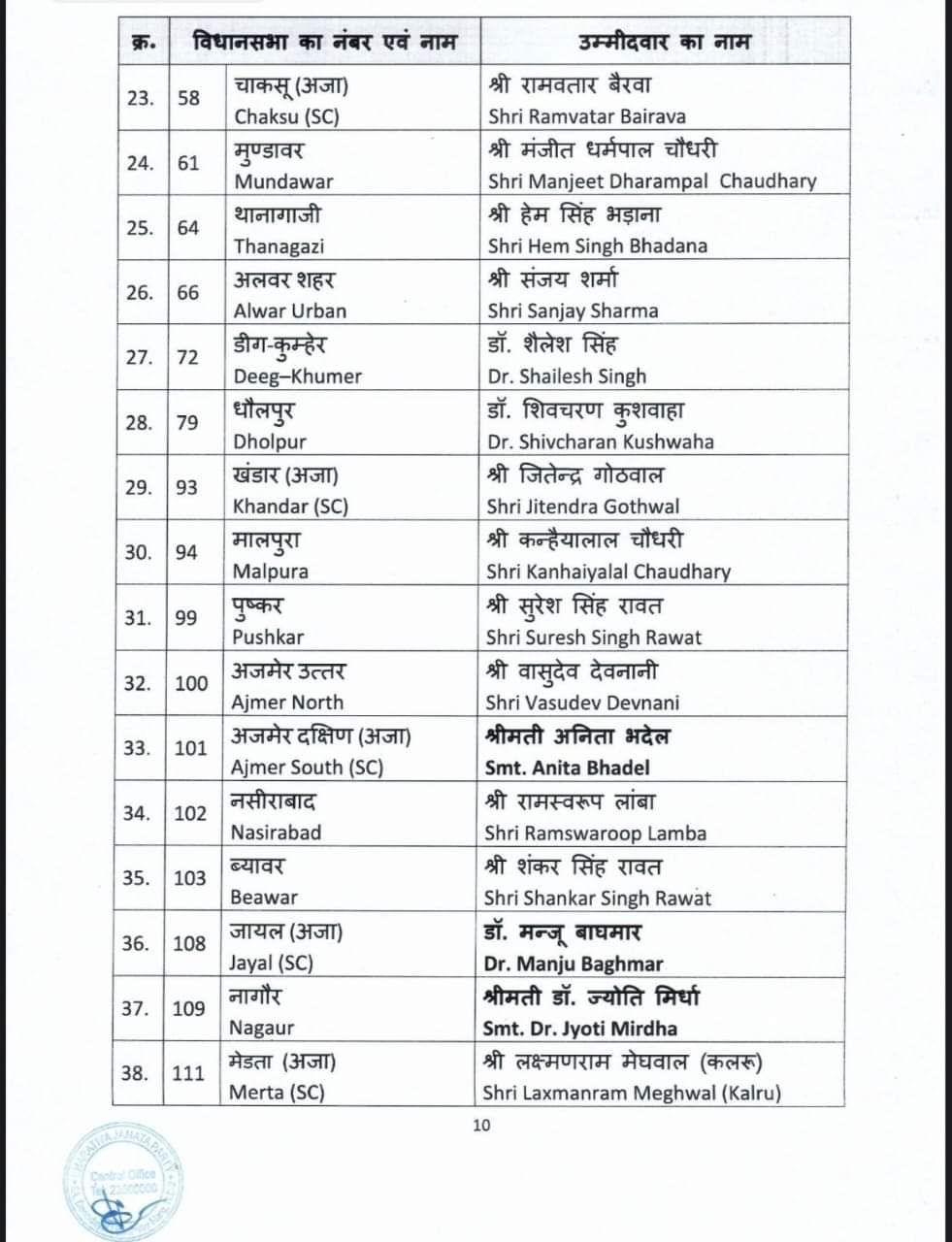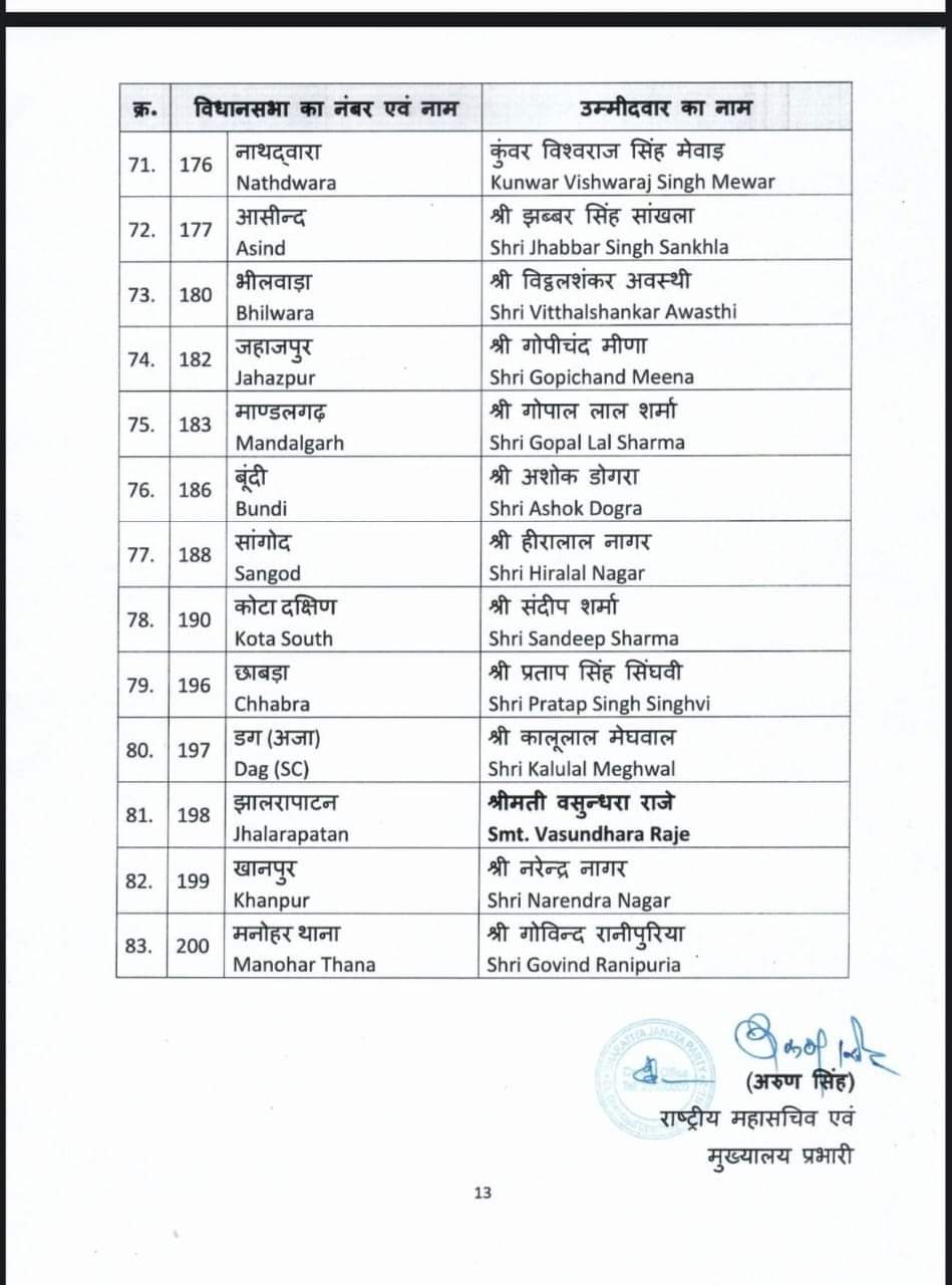 भाजपा ने पहली सूची में 41 नामों की घोषणा की थी और अब 83 नामों की घोषणा की है, पार्टी ने वसुंधरा राजे को अपनी ही सीट झालरापाटन से टिकट दिया गया है तो वहीं नेता प्रतिपक्ष राजेंद्र राठौड़ को तारानगर से उम्मीदवार बनाया गया है वो चूरू से विधायक थे। पार्टी ने अंबेर से पूर्व प्रदेश अध्यक्ष सतीश पूनिया को टिकट दिया गया है वहीँ कांग्रेस से भाजपा में आईं पूर्व सांसद ज्योति मिर्धा को नागौर से उम्मीदवार बनाया गया है।
