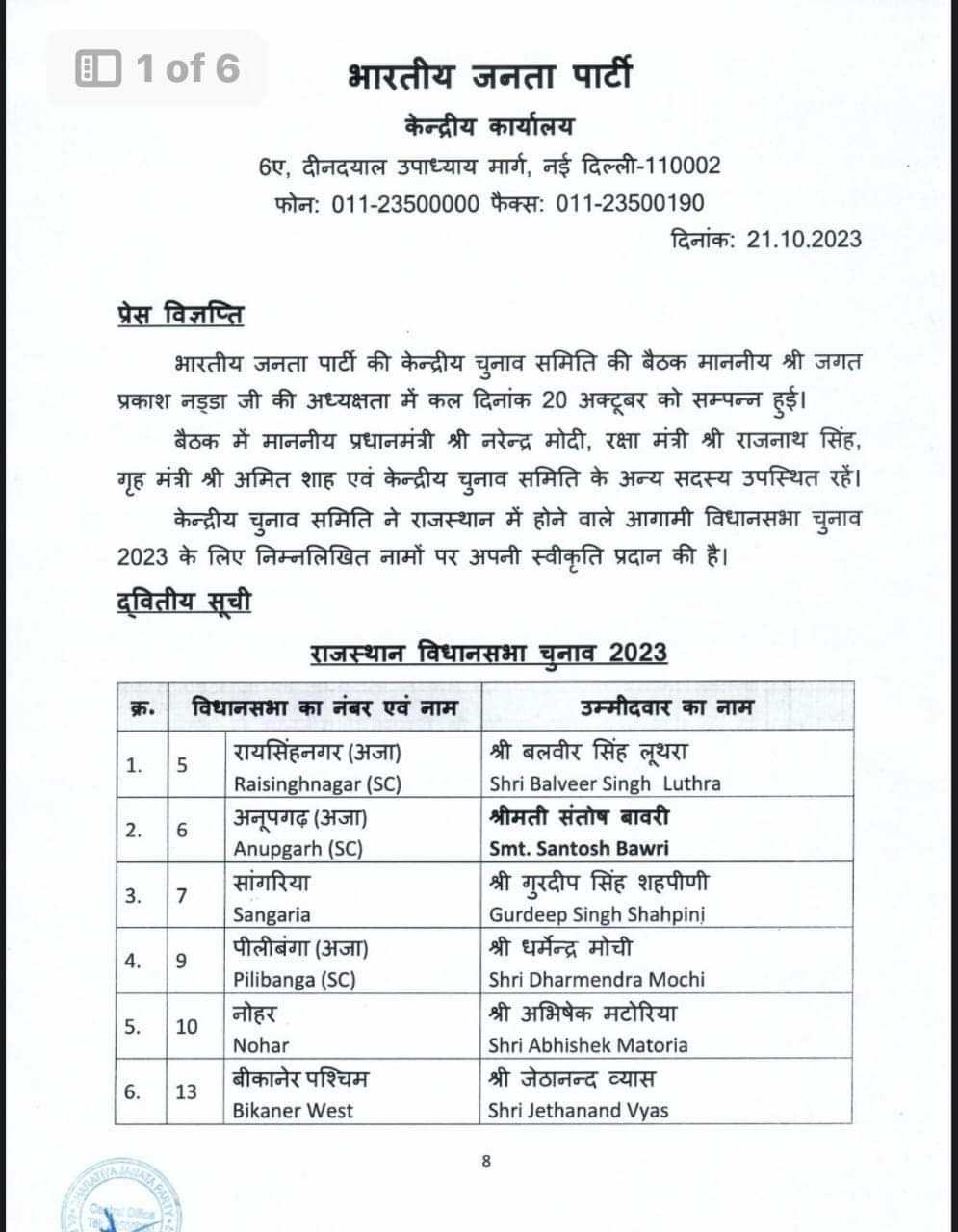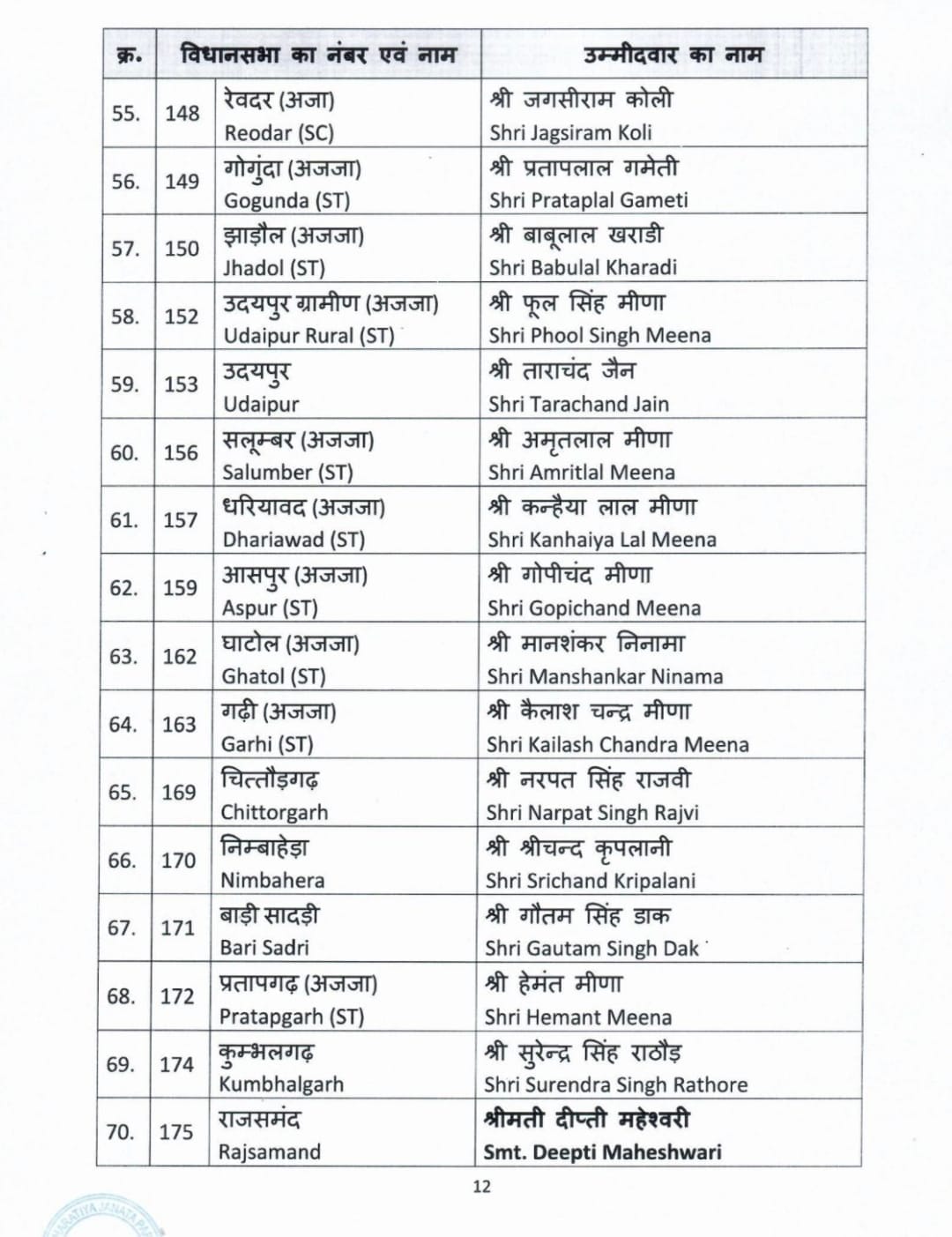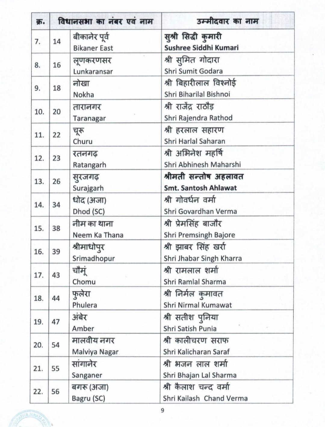 भाजपा ने पहली सूची में 41 नामों की घोषणा की थी और अब 83 नामों की घोषणा की है, पार्टी ने वसुंधरा राजे को अपनी ही सीट झालरापाटन से टिकट दिया गया है तो वहीं नेता प्रतिपक्ष राजेंद्र राठौड़ को तारानगर से उम्मीदवार बनाया गया है वो चूरू से विधायक थे। पार्टी ने अंबेर से पूर्व प्रदेश अध्यक्ष सतीश पूनिया को टिकट दिया गया है वहीँ कांग्रेस से भाजपा में आईं पूर्व सांसद ज्योति मिर्धा को नागौर से उम्मीदवार बनाया गया है।