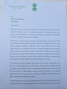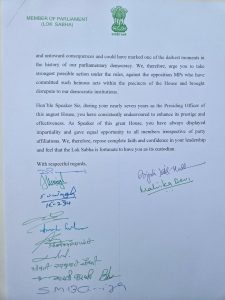 पत्र में यह भी शिकायत की गई है कि सदन की कार्यवाही के बाद, विपक्षी सांसदों का एक समूह लोकसभा अध्यक्ष के चैंबर की ओर भी आक्रामक तरीके से बढ़ा था।