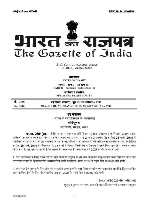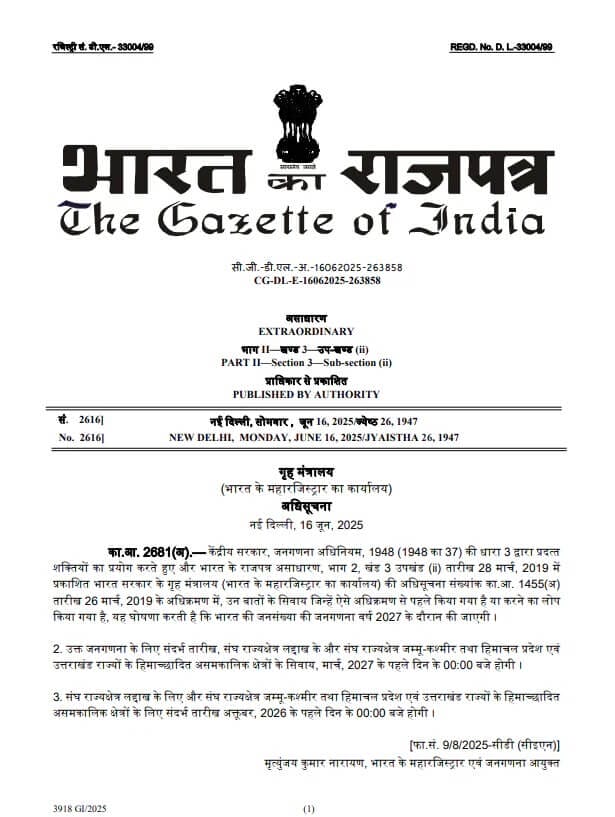 केंद्रीय गृह मंत्रालय ने भारत की 16वीं जनगणना के लिए अधिसूचना जारी कर दी है, अधिसूचना जारी करने से पहले केंद्रीय गृह मंत्री अमित शाह ने कल रविवार को केंद्रीय गृह सचिव गोविंद मोहन, रजिस्ट्रार जनरल और सेंसस कमिश्नर समेत अन्य वरिष्ठ अधिकारियों के साथ जनगणना की तैयारियों को लेकर समीक्षा भी की।