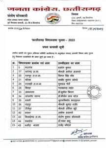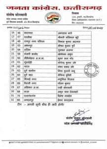बता दें कि जनता कांग्रेस पार्टी छत्तीसगढ़ के प्रदेश अध्यक्ष संतोष सोनवानी ने आज राष्ट्रीय अध्यक्ष डॉ. महताब रॉय एवं राष्ट्रीय महासचिव अमित वर्मा और प्रदेश चुनाव अभियान समिति के अनुमोदन पश्चात छत्तीसगढ़ में आगामी 2023 विधानसभा चुनाव हेतु 32 विधायक प्रत्याशियों की प्रथम सूची जारी की।