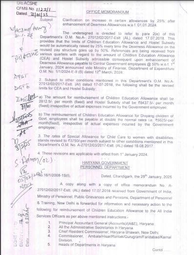 - बाल शिक्षा भत्ते के रूप में हर महीने 2812.5 रुपये और छात्रावास के लिए 8437.5 रुपये मासिक दिए जाएंगे। दिव्यांग बच्चों के लिए हर महीने 5625 रुपये का शिक्षा भत्ता और दिव्यांग महिला कर्मचारियों को बच्चों की देखभाल के लिए 3750 रुपये मिलेंगे। बढ़ा हुआ बाल शिक्षा भत्ता 1 जनवरी 2024 से मिलेगा। इस संबंध में कार्मिक विभाग ने पत्र जारी किया जा चुका है।