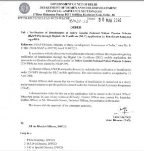 दिल्ली के पेंशनधारकों के लिए काम की खबर है। राज्य सरकार ने इंदिरा गांधी राष्ट्रीय विधवा पेंशन योजना के लाभार्थियों के लिए वेरिफिकेशन (सत्यापन) अनिवार्य कर दिया हैं। महिला और बाल विकास विभाग ने जिला कार्यालयों को 15 अप्रैल 2026 तक सभी लाभार्थियों का वेरिफिकेशन पूरा करने के निर्देश दिए हैं।