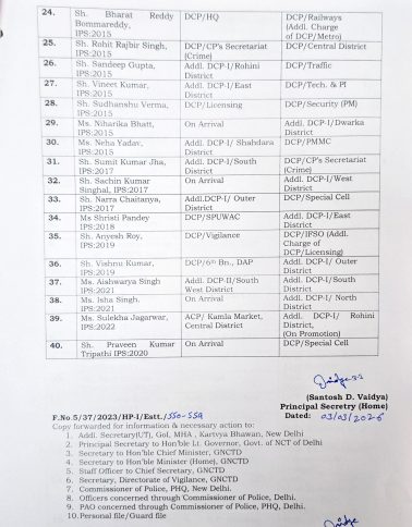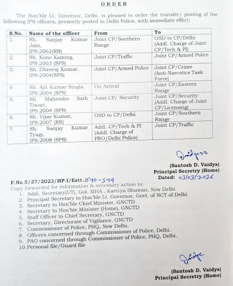इन तबादलों में कई संयुक्त पुलिस आयुक्त (Jt. CP) और अतिरिक्त पुलिस आयुक्त (Addl. CP) भी शामिल हैं। विजय कुमार को Jt. CP सदर्न रेंज की जिम्मेदारी मिली है, जबकि एम.एन. तिवारी लाइसेंसिंग विभाग देखेंगे।
