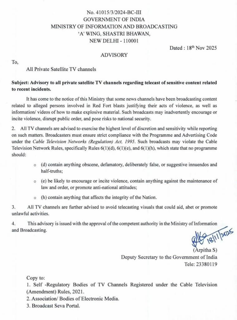 सूचना एवं प्रसारण मंत्रालय की उप सचिव अर्पिता एस के हस्ताक्षर से जारी एडवाइजरी में कहा गया है कि मंत्रालय के संज्ञान में आया है कि कुछ समाचार चैनल लाल किला विस्फोटों में शामिल कथित व्यक्तियों से संबंधित सामग्री प्रसारित कर रहे हैं, जिसमें उनके हिंसक कृत्यों को उचित ठहराया जा रहा है, साथ ही विस्फोटक सामग्री बनाने की जानकारी/वीडियो भी प्रसारित किए जा रहे हैं। ऐसे प्रसारण अनजाने में हिंसा को बढ़ावा दे सकते हैं या भड़का सकते हैं, सार्वजनिक व्यवस्था को बाधित कर सकते हैं और राष्ट्रीय सुरक्षा के लिए खतरा पैदा कर सकते हैं।