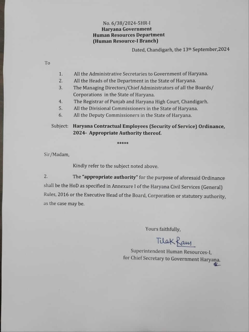Haryana Employees news : विधानसभा चुनाव से पहले हरियाणा के कच्चे कर्मचारियों के लिए खुशखबरी है। 1.30 लाख अनुबंधित कर्मचारियों की जॉब सिक्योरिटी के लिए लाए गए अध्यादेश के बाद अब हरियाणा के मुख्य सचिव टीवीएसएन प्रसाद ने इस संबंध में सभी विभागों, निगमों और बोर्डों को आदेश जारी किए हैं।
