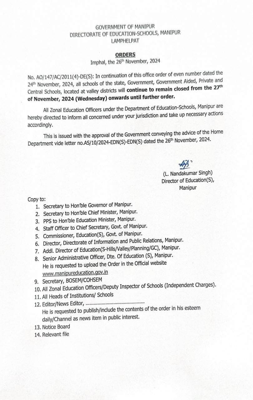 School Holiday 2024 : स्कूली छात्रों के लिए राहत भरी खबर है। मणिपुर सरकार ने कर्फ्यू वाले इलाकों में 27 नवंबर से सभी स्कूलों और कॉलेजों को अनिश्चितकाल के लिए बंद रखने का आदेश दिया है। इस दौरान इंफाल पूर्व और पश्चिम, विष्णुपुर, थौबल, काकचिंग और जिरिबाम जिलों के स्कूलों और कॉलेजों में कक्षाएं नहीं चलेंगी, जब तक अगला आदेश आदेश ना हो।