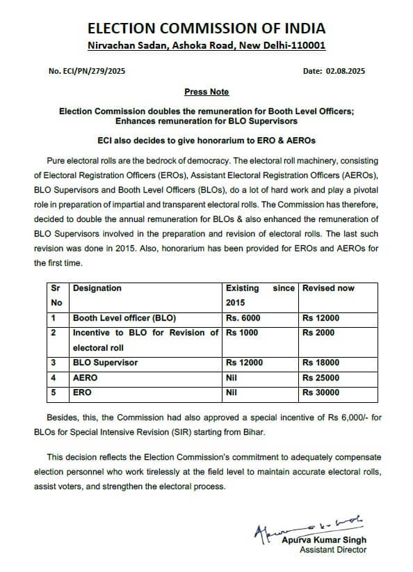 चुनाव कार्य में अपनी सेवाएं देने वाले BLO सहित अन्य कर्मचारियों को भारत निर्वाचन आयोग ने बिहार चुनाव से पहले तोहफा दिया है, इलेक्शन कमीशन ने बूथ लेवल ऑफिसर्स के पारिश्रमिक में वृद्धि करने का फैसला करते हुए इसे दो गुना कर दिया है यानि अभी तक उन्हें पारिश्रमिक मिलता था उससे डबल मिलेगी, इसके अलावा चुनाव आयोग ने पहली बार एईआरओ एवं ईआरओ को भी मानदेय देने का निर्णय लिया है
