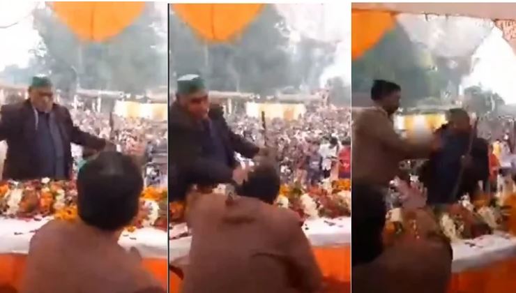लखनऊ, डेस्क रिपोर्ट। यूपी विधानसभा चुनाव 2022 (UP Assembly Election 2022) की हलचल के बीच सोशल मीडिया पर एक वीडियो तेजी से वायरल हो रहा है, जिसमें एक किसान नेता मंच पर बैठे एक बीजेपी विधायक को थप्पड़ मारते हुए नजर आ रहा है।इस वीडियो को समाजवादी पार्टी की ओर से भी ट्वीटर पर शेयर किया गया है। हालांकि अभी तक शख्स की पहचान नहीं हो पाई है, लेकिन वीडियो तेजी से वायरल (Video Viral) हो रहा है।